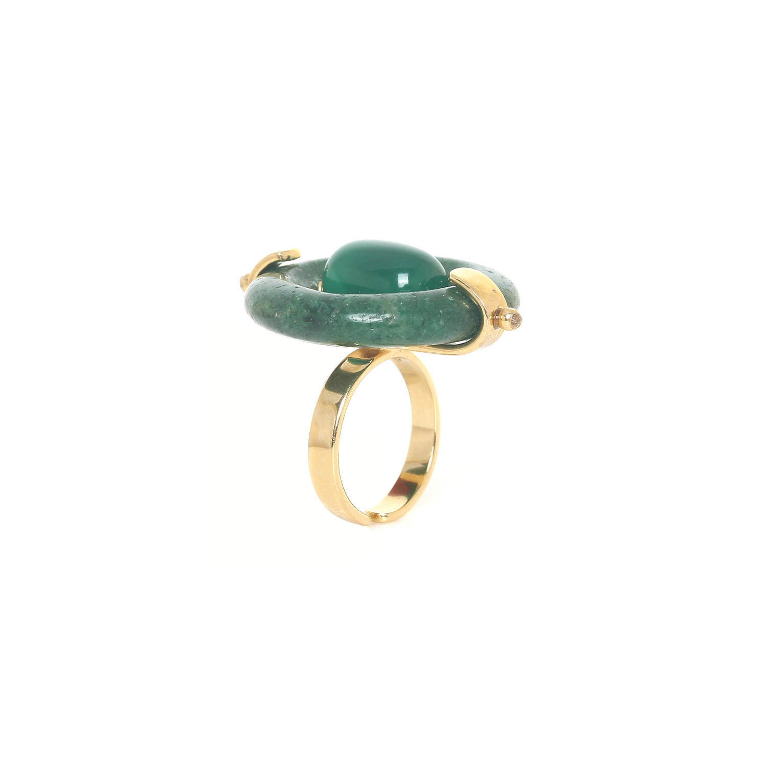 ფრანგული ბრენდი Nature Bijoux ს ხელნაკეთი ბეჭედი, კოლექციიდან AGATA VERDE. სამკაულის ბაზად გამოყენებულია თითბერი, კოლექციაში გამოყენებული ნატურალური მასალები და ქვები: აგატი, ნეფრიტი, ავანტურინი.