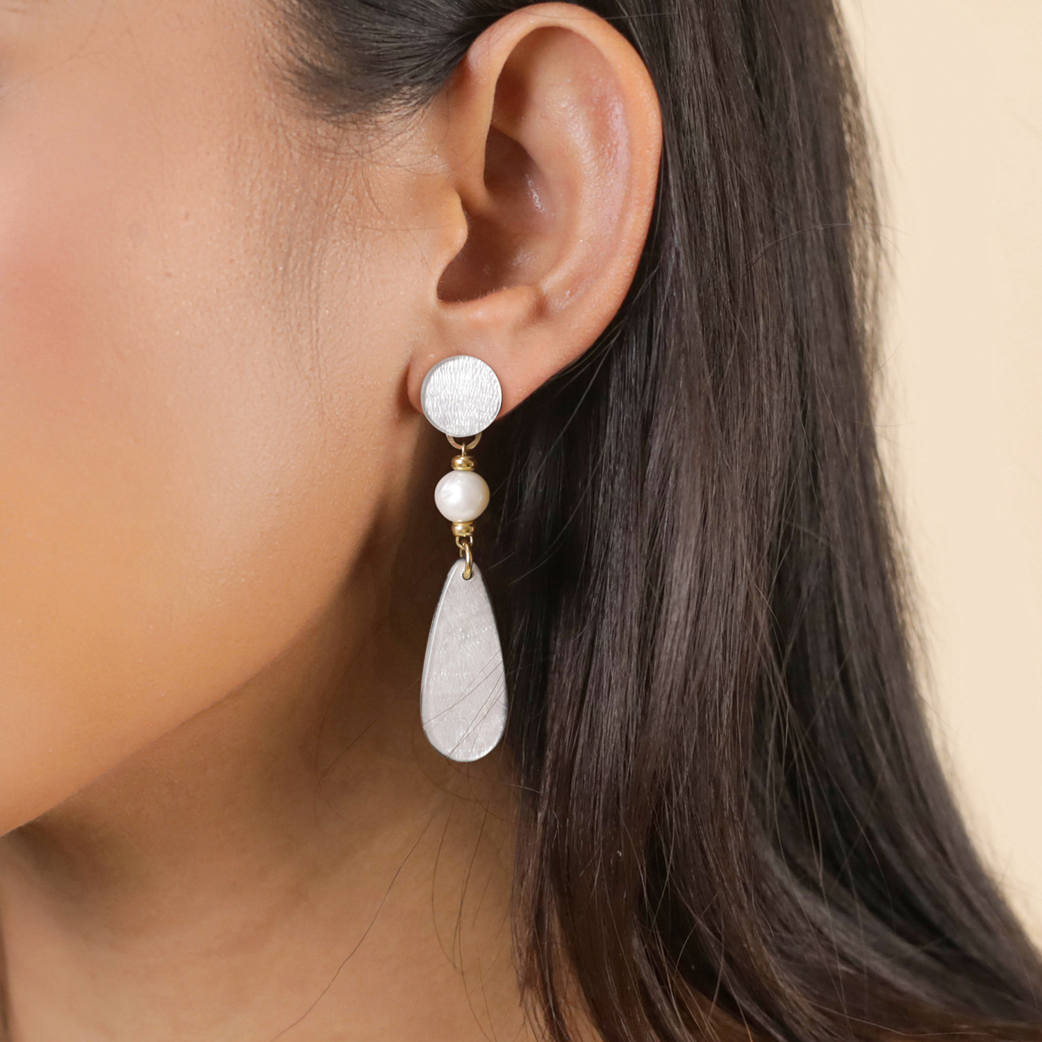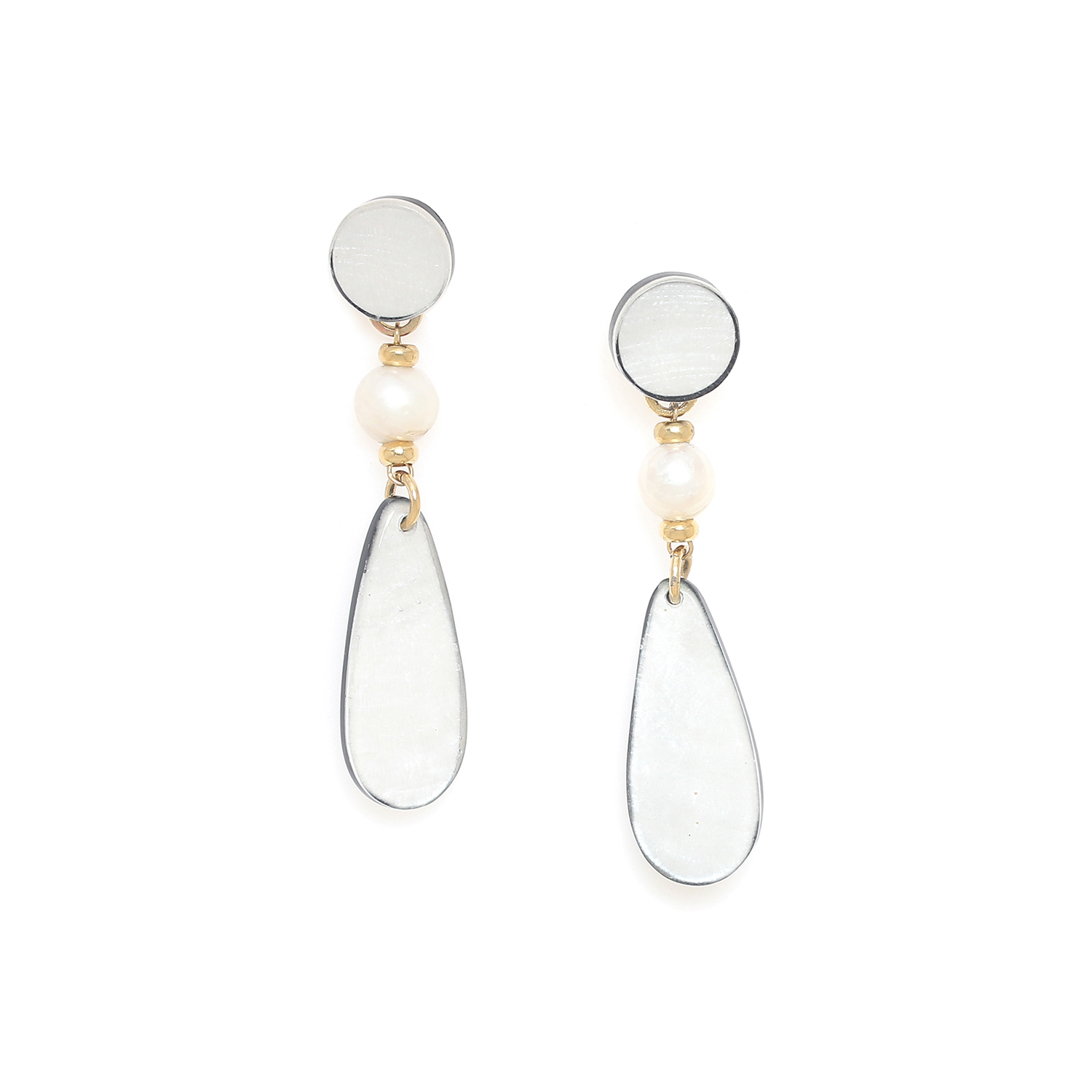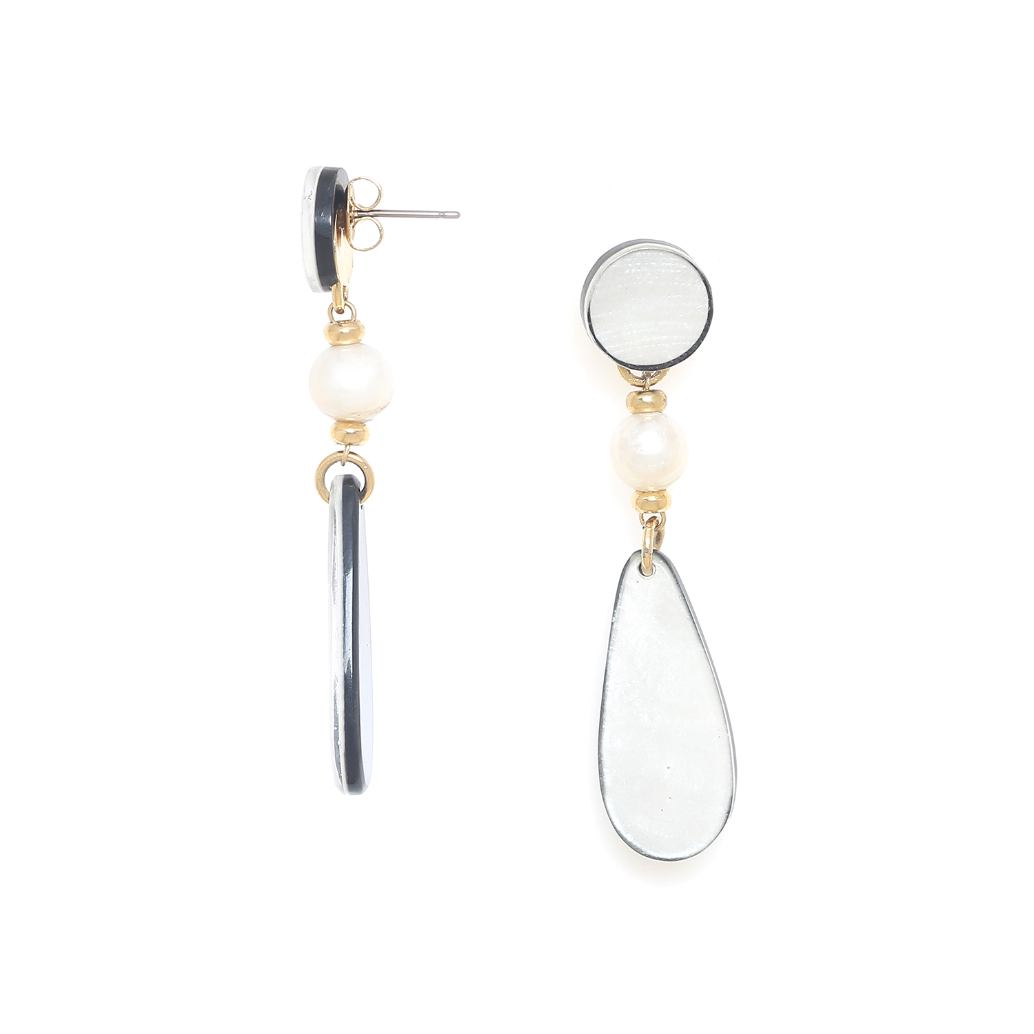 ფრანგული ბრენდი Nature Bijoux ს ხელნაკეთი საყურე, კოლექციიდან MOONLIGHT. სამკაულის ბაზად გამოყენებულია თითბერი, კოლექციაში გამოყენებული ნატურალური მასალები და ქვები: მარგალიტი, სადაფი,ტყავი.