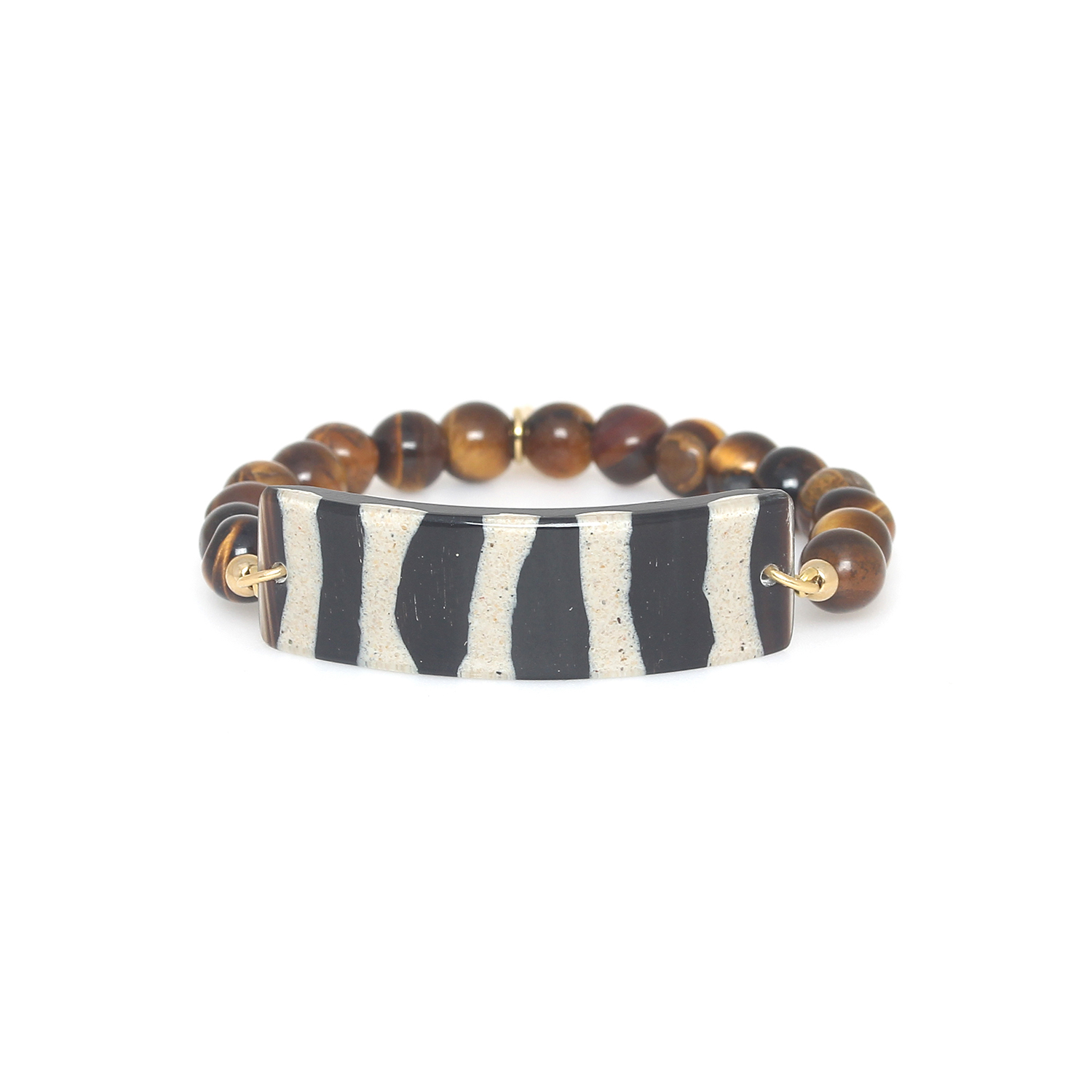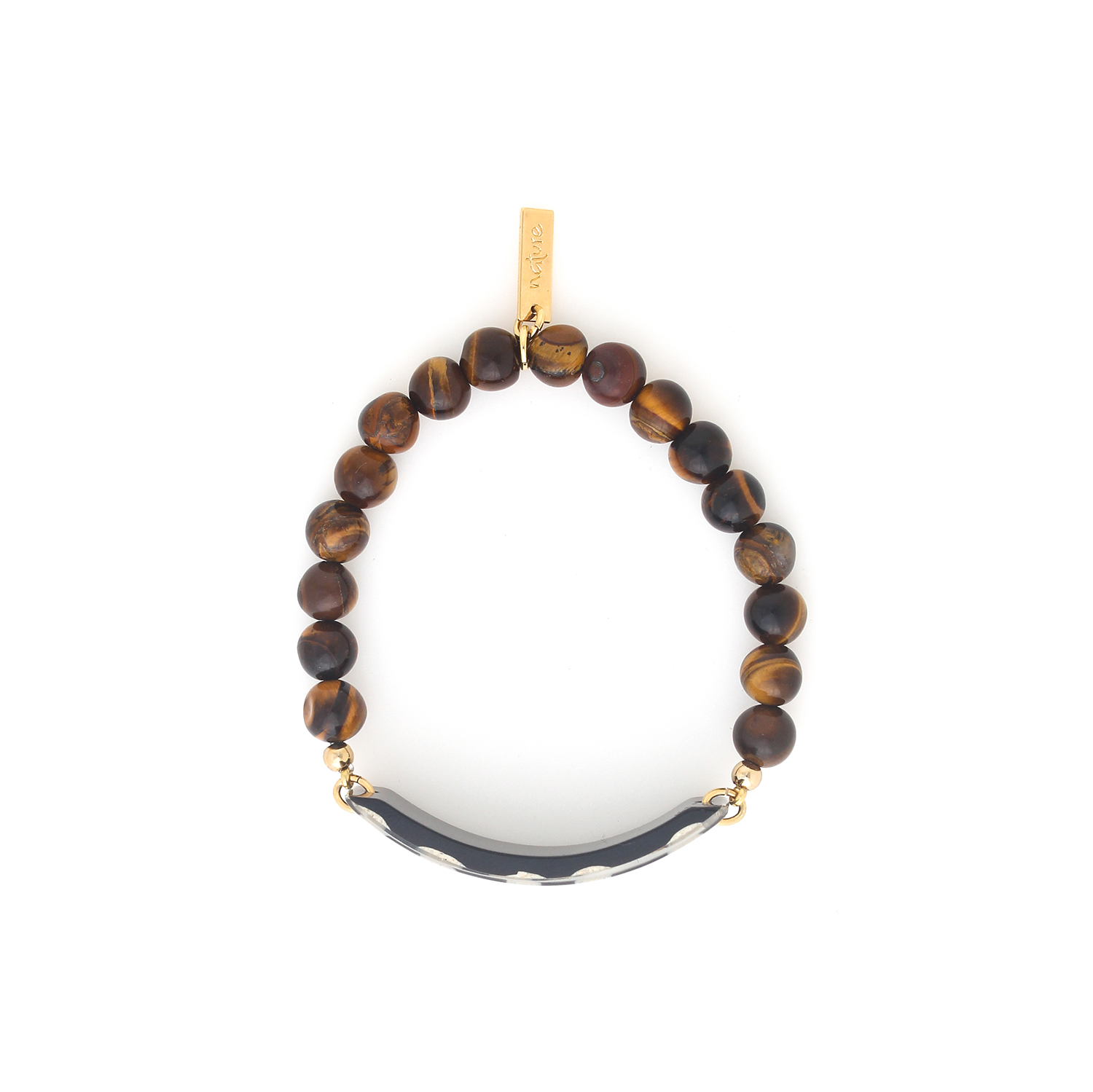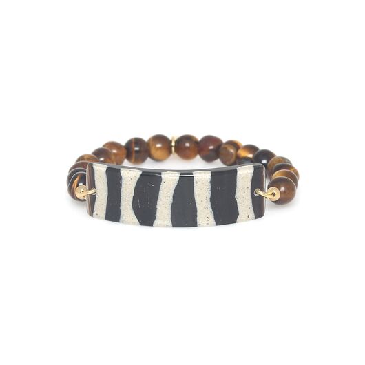 ფრანგული ბრენდი Nature Bijoux ს ხელნაკეთი სამაჯური, კოლექციიდან ZEBRA. სამკაულის ბაზად გამოყენებულია თითბერი, კოლექციაში გამოყენებული ნატურალური მასალები და ქვები: რქა, ფისში დამუშავებული ქვიშა, სადაფი, ვეფხვის თვალი.