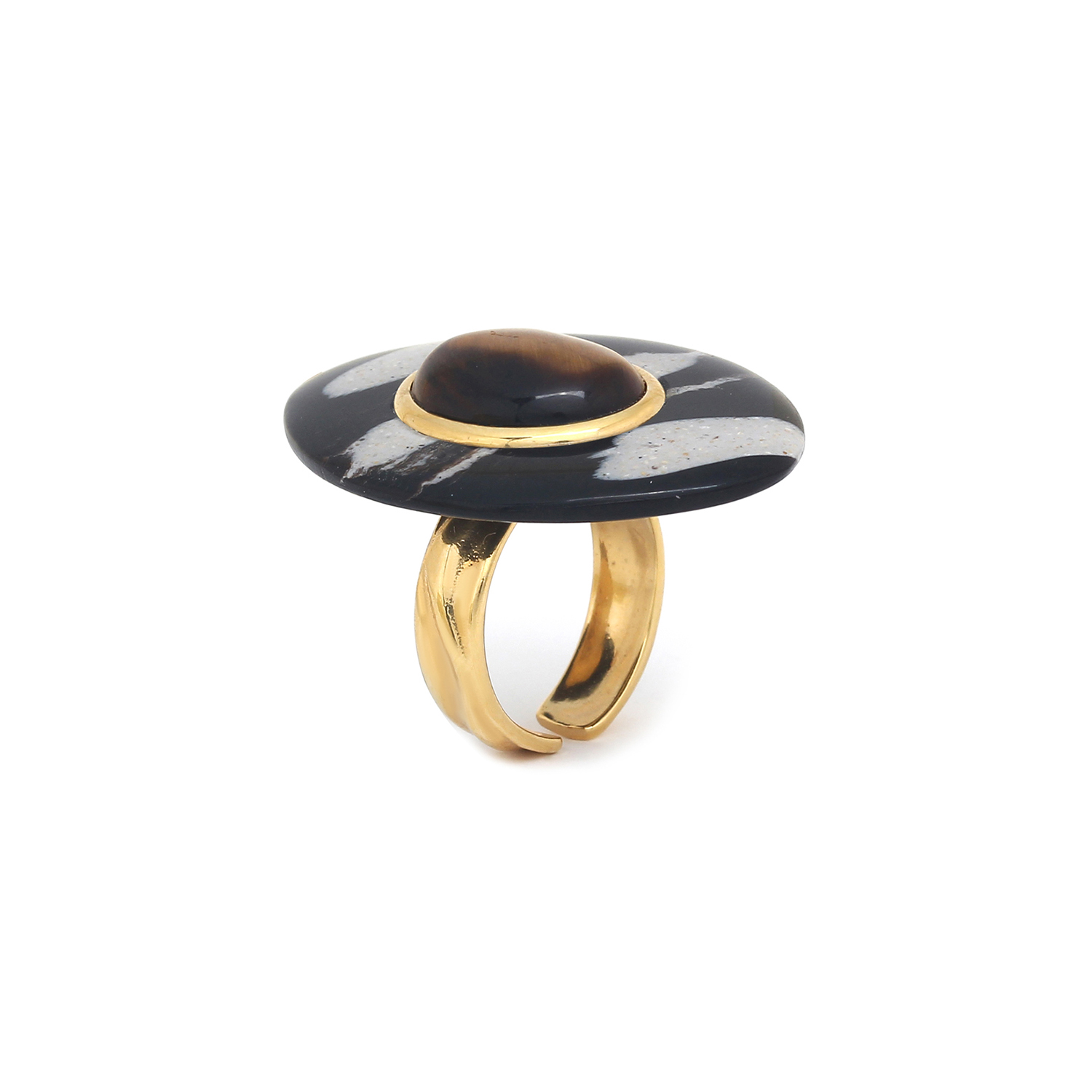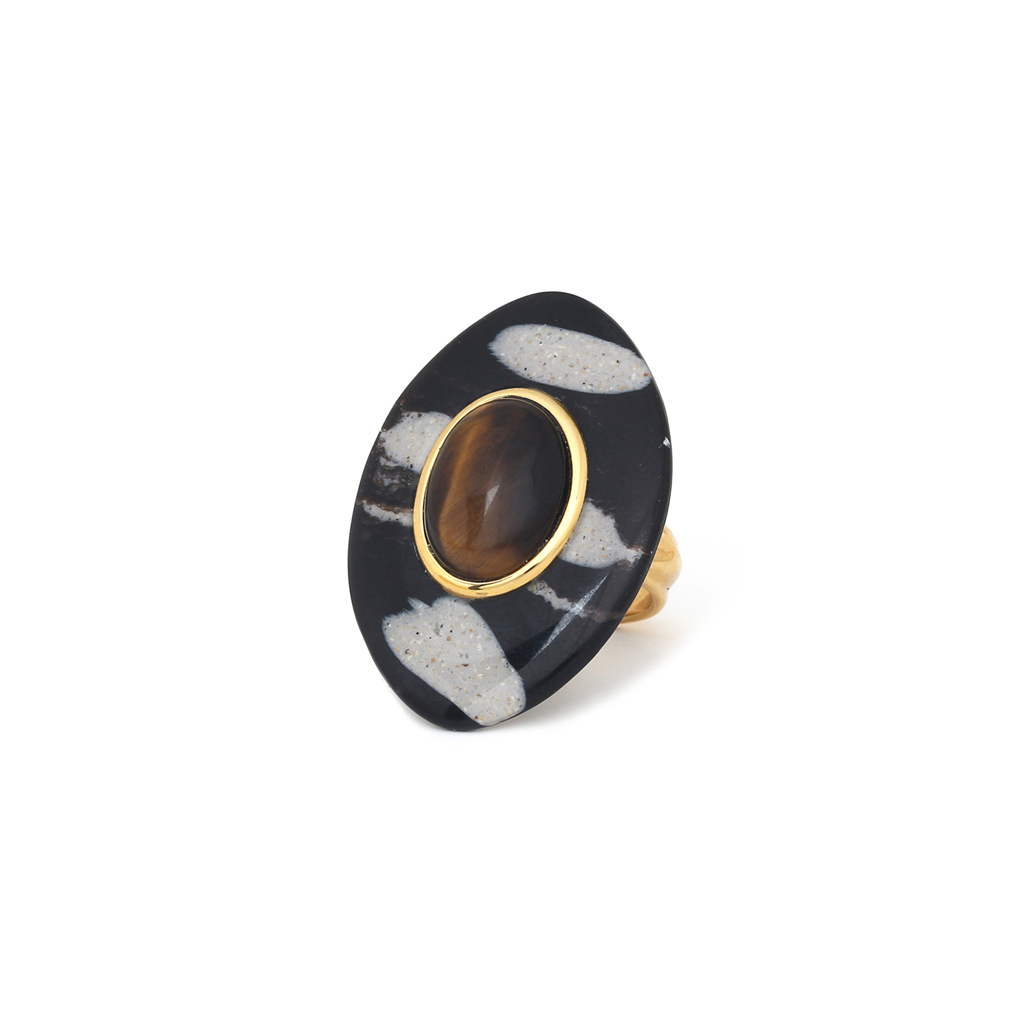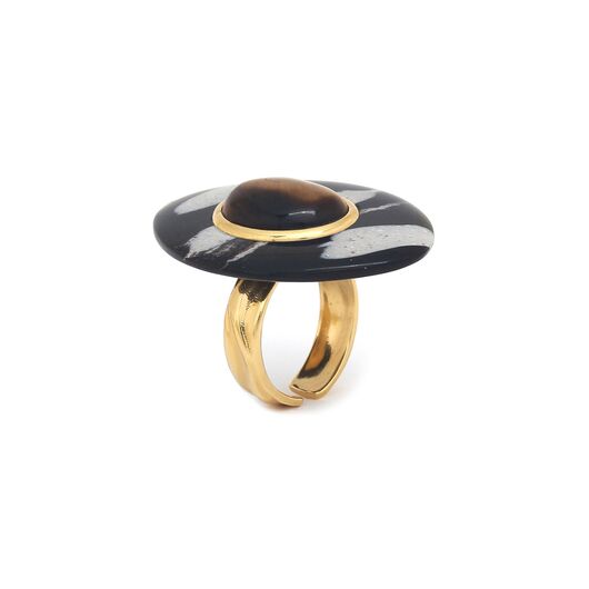 ფრანგული ბრენდი Nature Bijoux-ს ხელნაკეთი ბეჭედი კოლექციიდან ZEBRA. სამკაულის ბაზად გამოყენებულია თითბერი. კოლექციაში გამოყენებული ბუნებრივი მასალები და ქვები: რქა, ფისში გაქვავებული ქვიშა, სადაფი, ვეფხვის თვალი