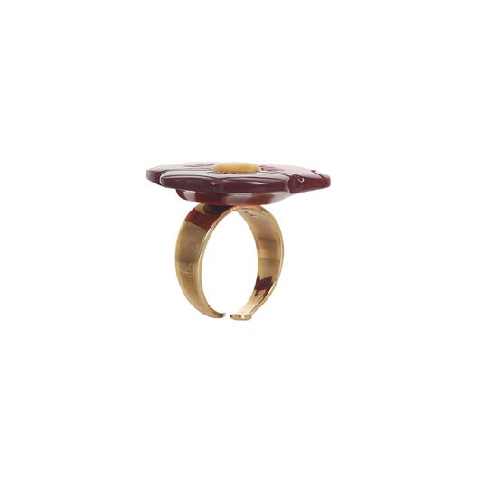 ფრანგული ბრენდი Nature Bijou-ს ხელნაკეთი ბეჭედი, კოლექციიდან SON JARDIN. სამკაულის ბაზად გამოყენებულია თითბერი, კოლექციაში გამოყენებული ნატურალური მასალები და ქვები: ბეიონგის ხე, ყავისფერი სადაფი, შეღებილი რქა, ოქროსფერი სადაფი