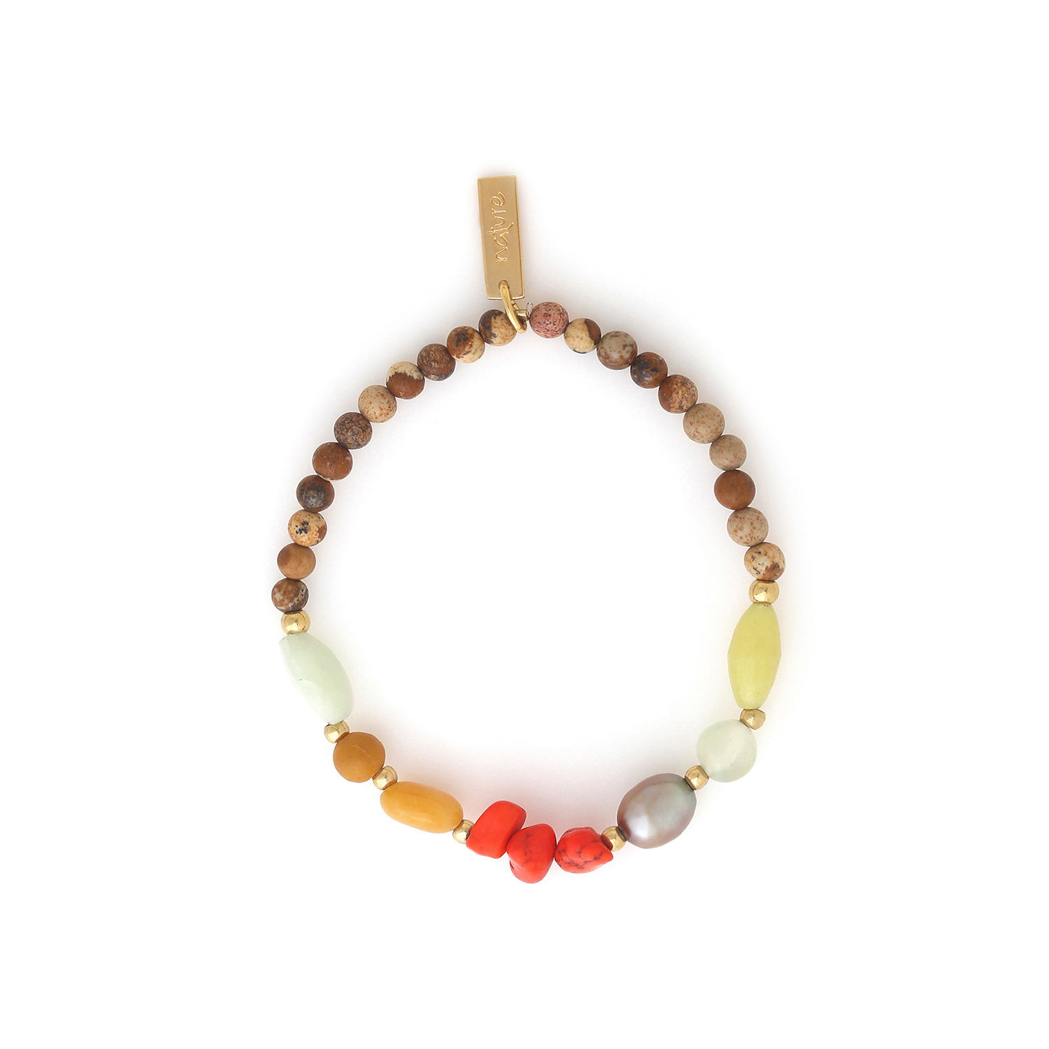 ფრანგული ბრენდი Nature Bijoux-ს ხელნაკეთი სამაჯური კოლექციიდან TIVOLI. სამკაულის ბაზად გამოყენებულია თითბერი. კოლექციაში გამოყენებული ბუნებრივი მასალები და ქვები: ყავისფერი სადაფი, მარგალიტი, ჰაულიტი, ნეფრიტი, იასპი, ყავისფერი იასპი, ვეფხვის თვალი,