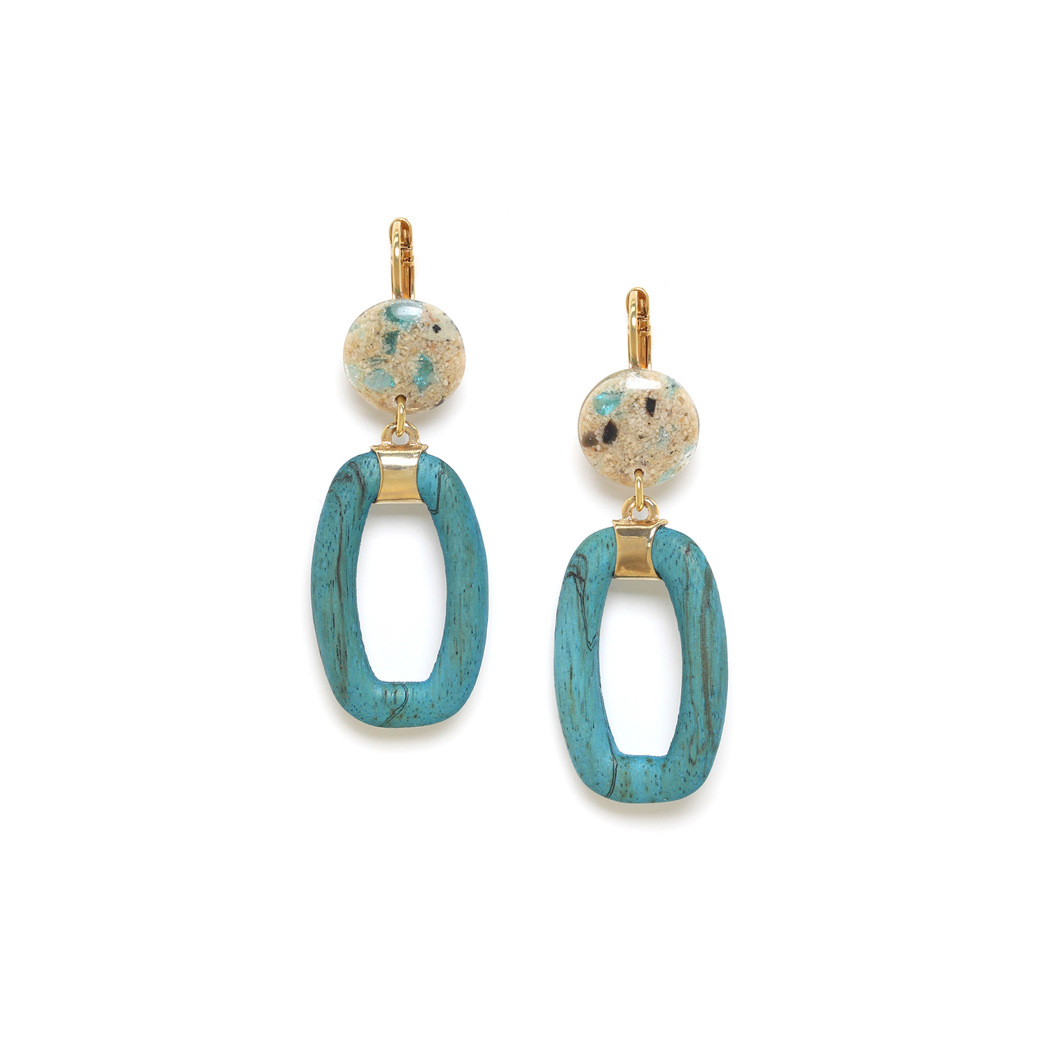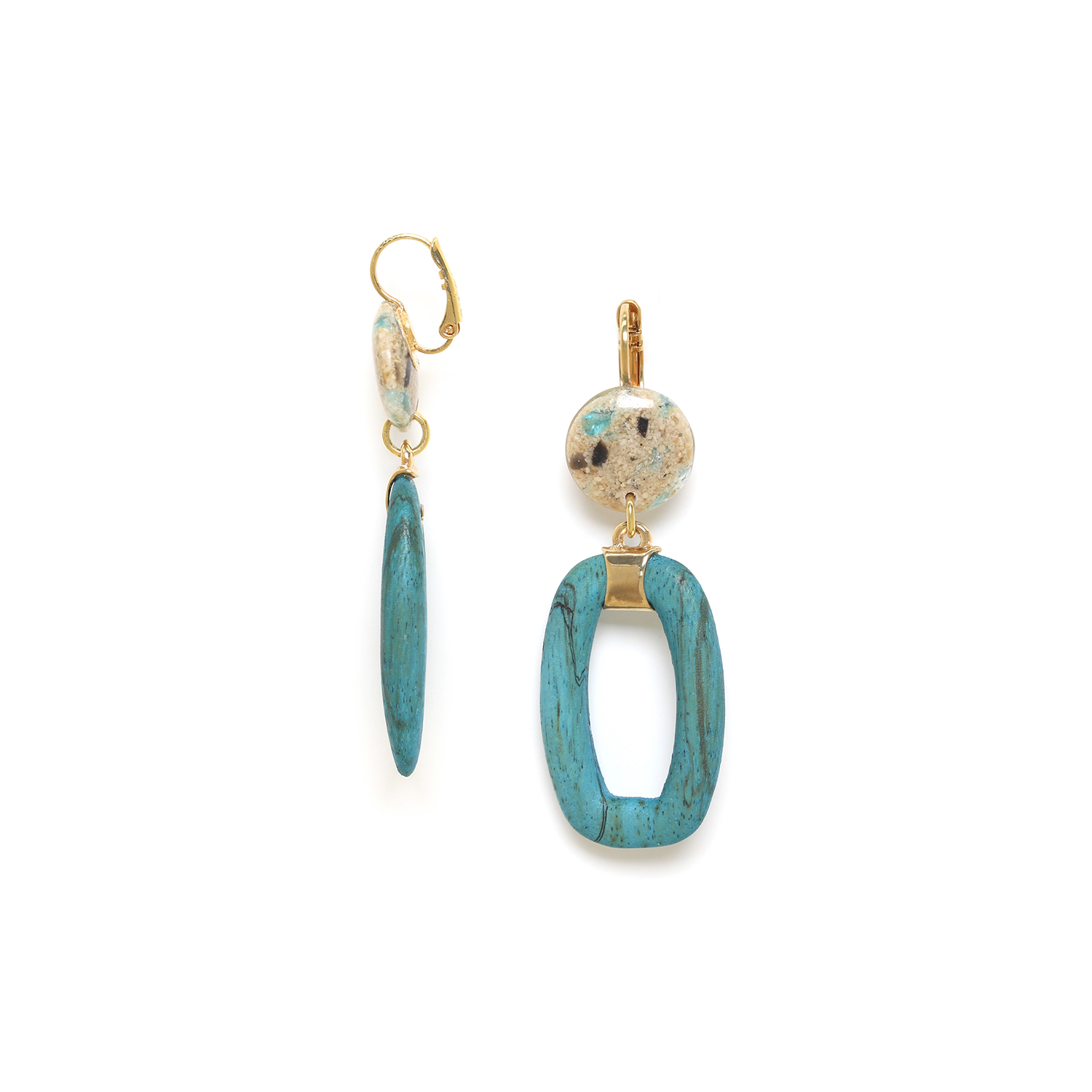 ფრანგული ბრენდი Nature Bijoux-ს ხელნაკეთი საყურე კოლექციიდან SOLENZARA. სამკაულის ბაზად გამოყენებულია თითბერი. კოლექციაში გამოყენებული ბუნებრივი მასალები და ქვები: სადაფი, ტყავი, ჰაულიტი, ქვიშა, თამარინდი