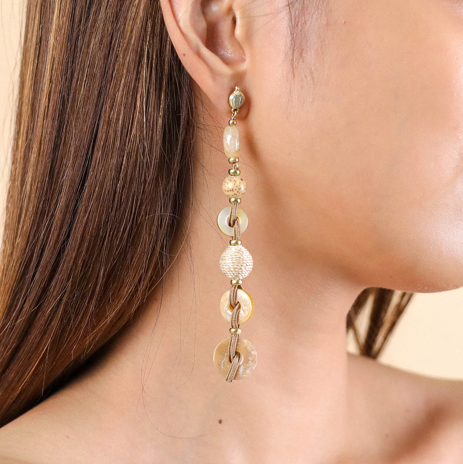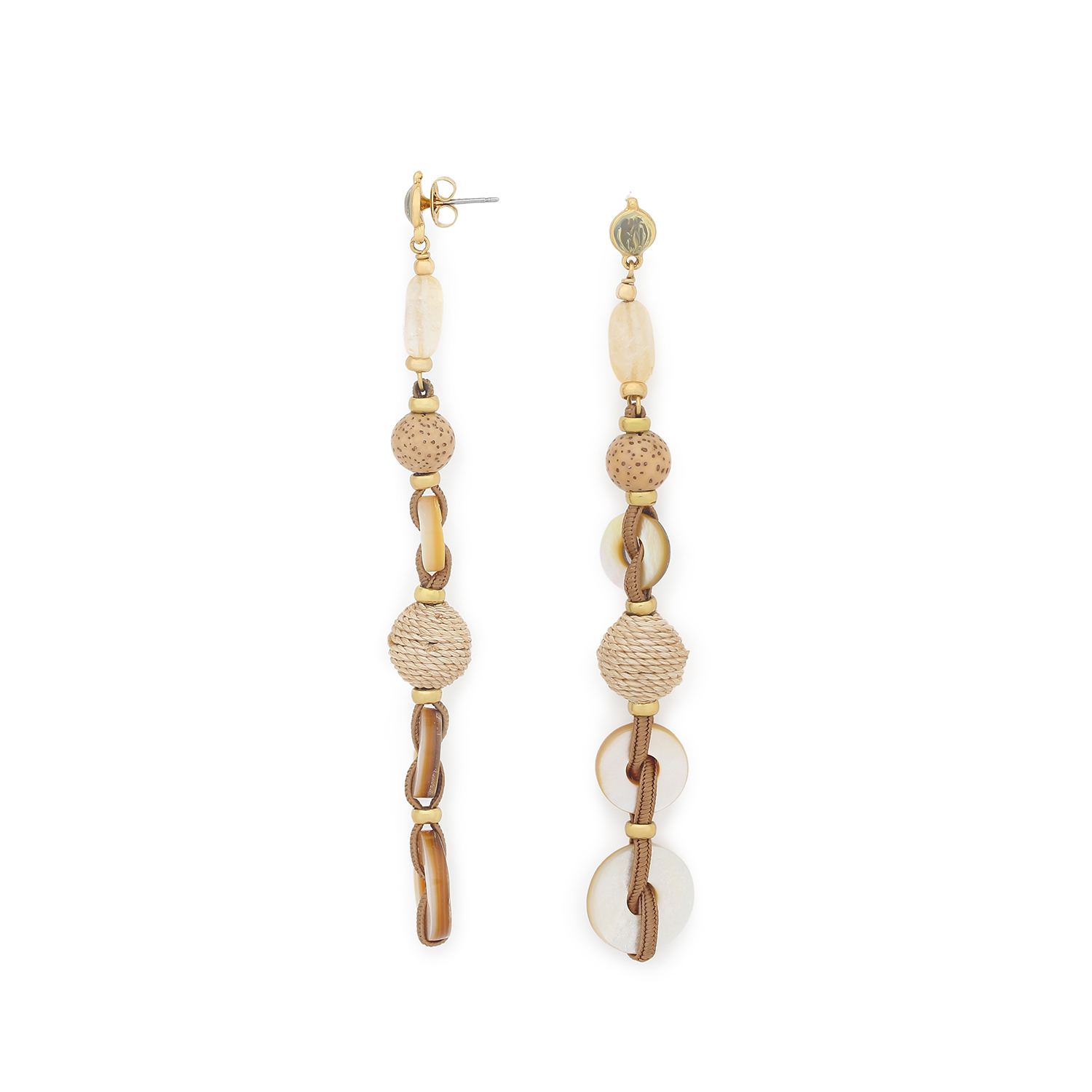 ფრანგული ბრენდი Nature Bijoux-ს ხელნაკეთი საყურე კოლექციიდან WABI. სამკაულის ბაზად გამოყენებულია თითბერი. კოლექციაში გამოყენებული ბუნებრივი მასალები და ქვები: ციტრინი, მცენარის ბოჭკო, ამონიტი, ბოდის მარცვლები, სადაფი, ნაცრისფერი აბანოზის ხე