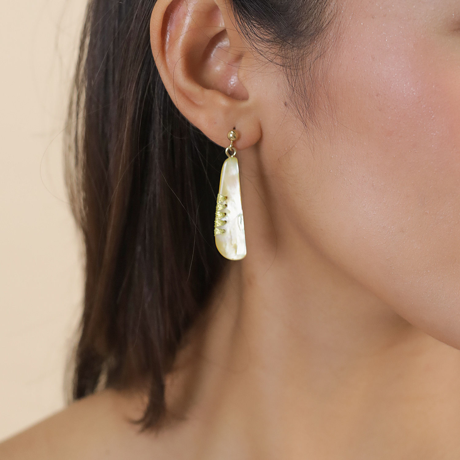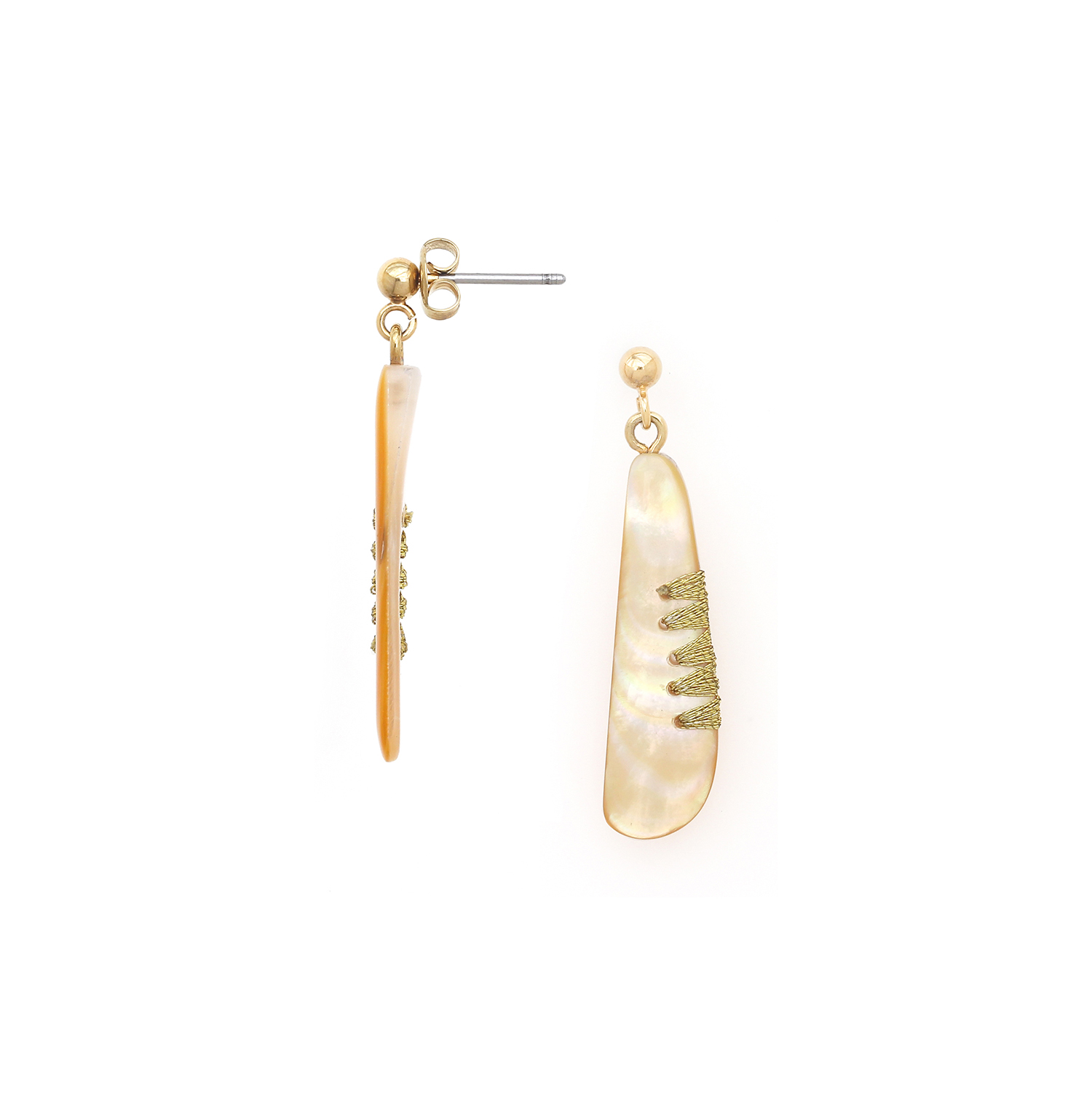 ფრანგული ბრენდი Nature Bijoux-ს ხელნაკეთი საყურე კოლექციიდან CALLIOPE. სამკაულის ბაზად გამოყენებულია თითბერი. კოლექციაში გამოყენებული ბუნებრივი მასალები და ქვები: სადაფი, ყავისფერი სადაფი, ოქროსფერი ძაფი, ოქროსფერი სადაფი,