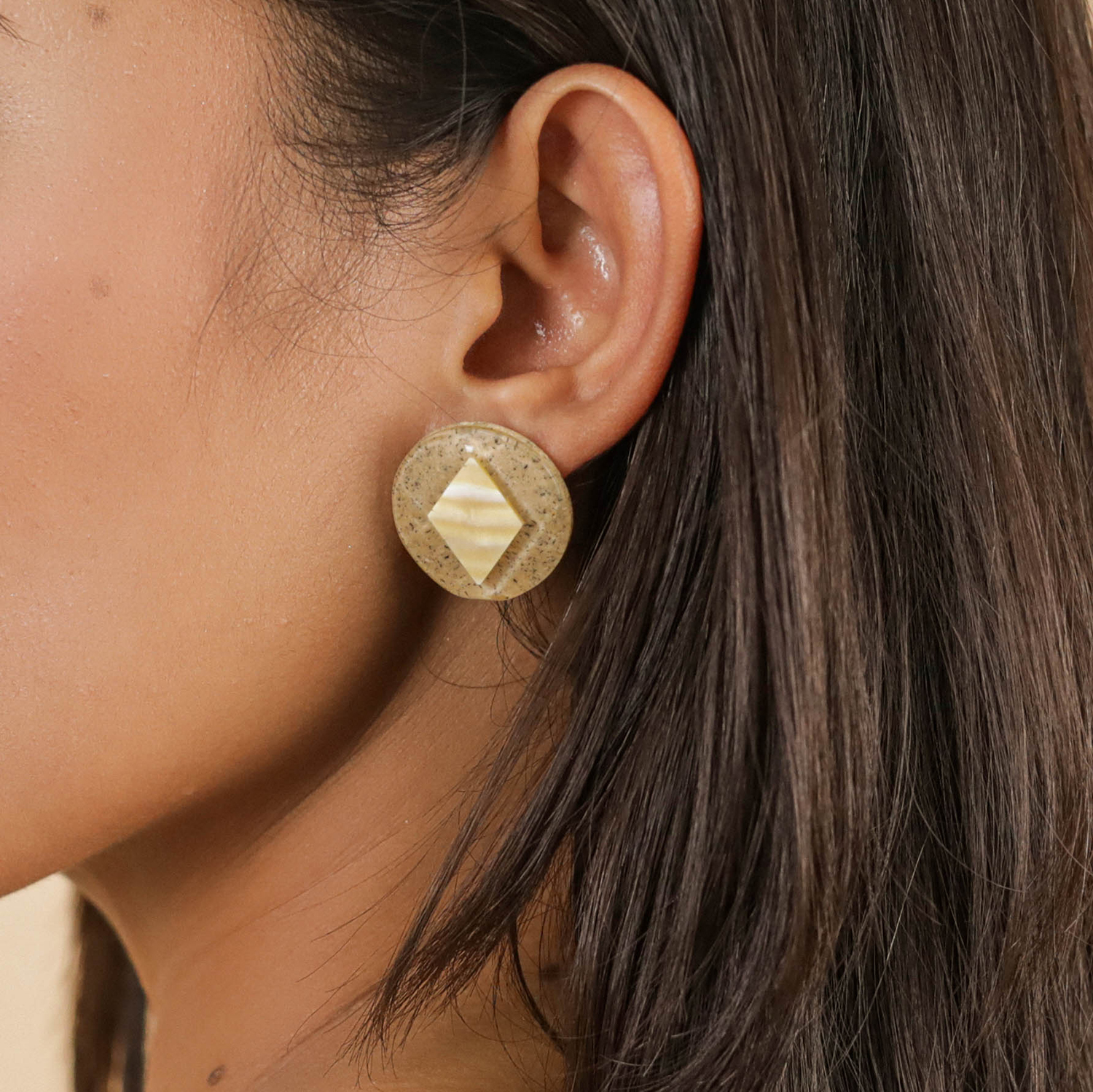ფრანგული ბრენდი Nature Bijoux-ს ხელნაკეთი საყურე კოლექციიდან GOLDEN HOUR. სამკაულის ბაზად გამოყენებულია თითბერი. კოლექციაში გამოყენებული ბუნებრივი მასალები და ქვები: დამუშავებული ბამბის ძაფი, ტყავი, ქვიშა, ოქროსფერი სადაფი,კალის შენადნობი