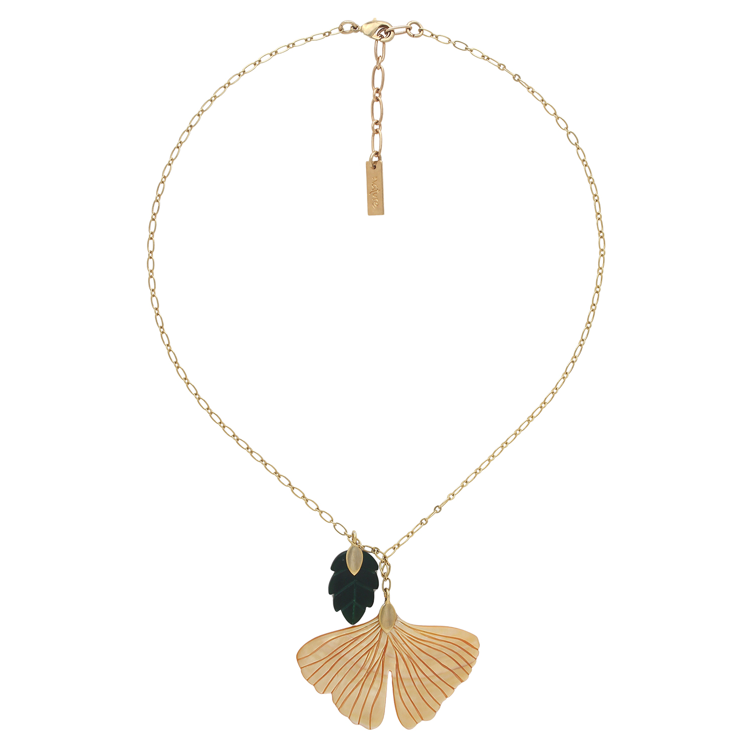 ფრანგული ბრენდი Nature Bijou-ს ხელნაკეთი ყელსაბამი, კოლექციიდან SON JARDIN. სამკაულის ბაზად გამოყენებულია თითბერი, კოლექციაში გამოყენებული ნატურალური მასალები და ქვები: ბეიონგის ხე, ყავისფერი სადაფი, შეღებილი რქა, ოქროსფერი სადაფი