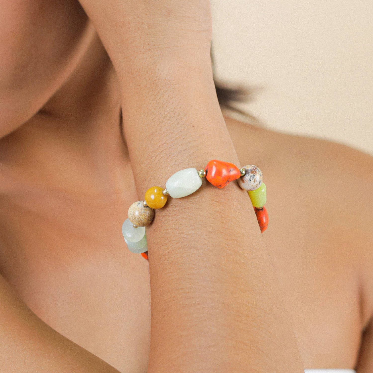 ფრანგული ბრენდი Nature Bijoux ს ხელნაკეთი სამაჯური, კოლექციიდან TIVOLI. სამკაულის ბაზად გამოყენებულია თითბერი, კოლექციაში გამოყენებული ნატურალური მასალები და ქვები: ყავისფერი სადაფი, მარგალიტი, ჰუალიტი, ნეფრიტი, იასპი, ყავისფერი იასპი, ვეფხვის თვალი, თითბერი.