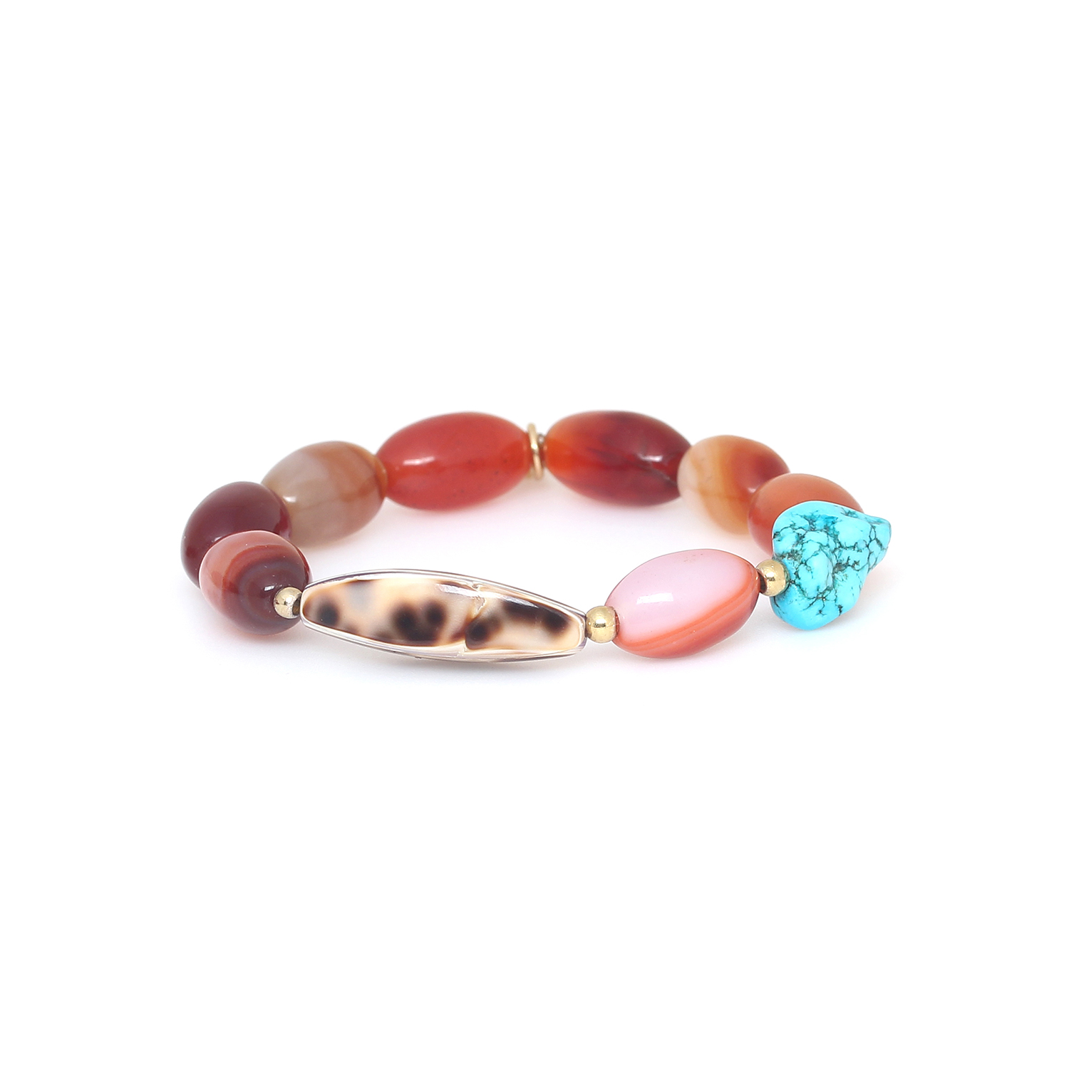 ფრანგული ბრენდი Nature Bijoux ს ხელნაკეთი სამაჯური, კოლექციიდან SURABAYA. სამკაულის ბაზად გამოყენებულია თითბერი, კოლექციაში გამოყენებული ნატურალური მასალები და ქვები: წითელი აგატი, ჰუალიტი, ზღვის ლოკოკინა, თითბერი.